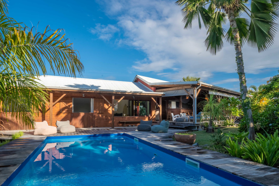 Superb exotic villa with swimming pool and large wooden deck between Saint François and le Moule. Surf spot accessible by foot.