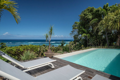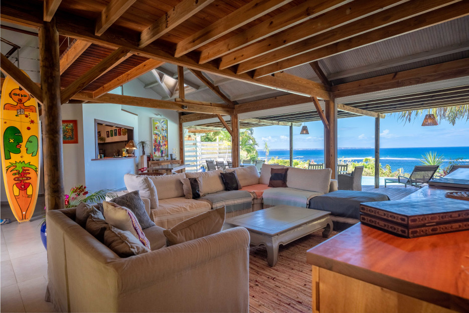 The airy living room extends naturally to the outside thanks to large openings on the pool and the sea, from February to May you can see the breath of the humpback whales passing by !