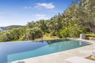 The gardens are beautifully landscaped to create an inviting and serene atmosphere, with the elevated position offering unparalleled views and privacy. The ancient olive trees and rustic terraces marry the villa's contemporary design with the natural beauty of the island.