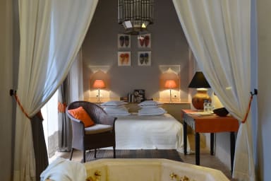 - a first suite on the ground floor with a double bed, high ceilings, a large Ottoman bath, and oriental decor,
