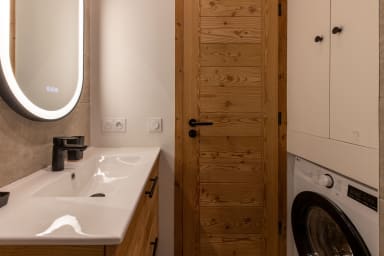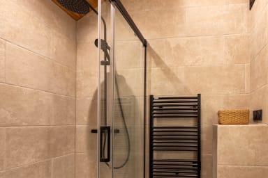 - Shower room with shower, toilet, washer/dryer, and ample storage