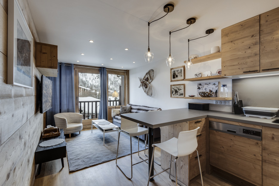 - Bright living room with fully equipped open kitchen: ceramic hob, combination microwave, dishwasher, toaster, kettle, and Nespresso coffee machine. This living space opens onto a west-facing balcony with breathtaking views of Bellevarde.