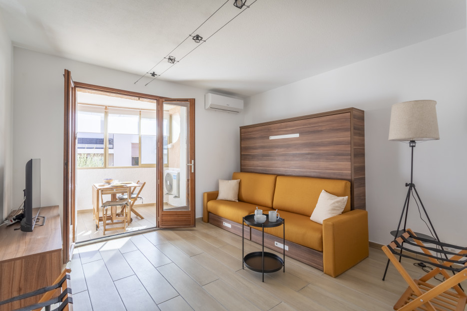 - a light-filled living area with a comfortable 140 × 200 sofa bed,