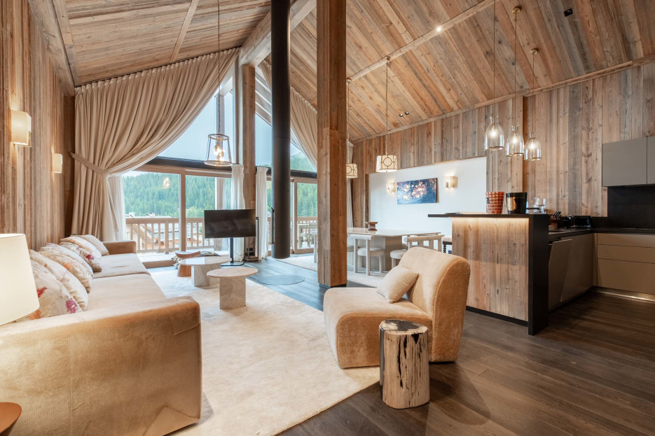A unique retreat at the foot of the slopes, combining two connected apartments to create a vast space that blends elegance, comfort, and conviviality. Enjoy a ski-in/ski-out penthouse with access to the spa (swimming pool, jacuzzi, hammam, sauna), the Lounge Bar, the fitness room, as well as exclusive services: porter, valet, private shuttle, and 24/7 concierge.