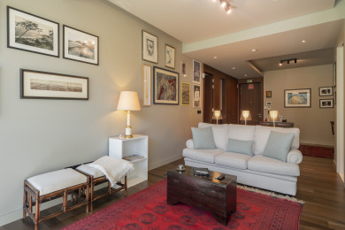 Modern and sophisticated apartment, with an inspiring artistic decoration present in all areas. This property has a suite, with double bed, bathroom with "walk-in shower", direct access to the garden, which provides a cosy atmosphere. The living room area, with view and access to the garden, cable TV and a comfortable sofa, is shared with the dining area. The kitchen is large, fully equipped and also connects to the outside. There is a guest WC available.