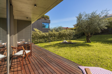 The private garden, with dining table and sun lounger, is the ex-libris of this apartment.