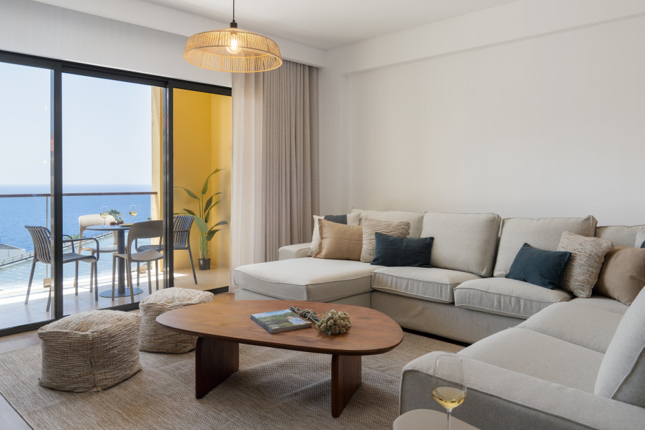 The private area includes a suite with a king-size bed and en-suite bathroom, one bedroom with a double bed, and another with two single beds – ideal for families or groups. A second bathroom with a shower serves the additional rooms, ensuring comfort and convenience. The fully equipped kitchen includes a laundry area, offering greater independence during your stay. The living room is bright and spacious, with access to a balcony featuring beautiful sea views – the perfect spot to unwind at the end of the day.
