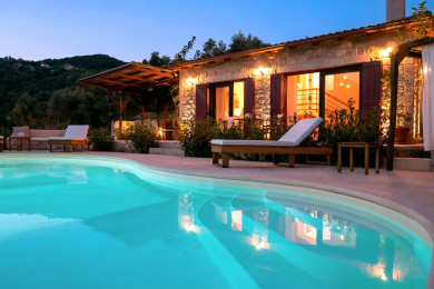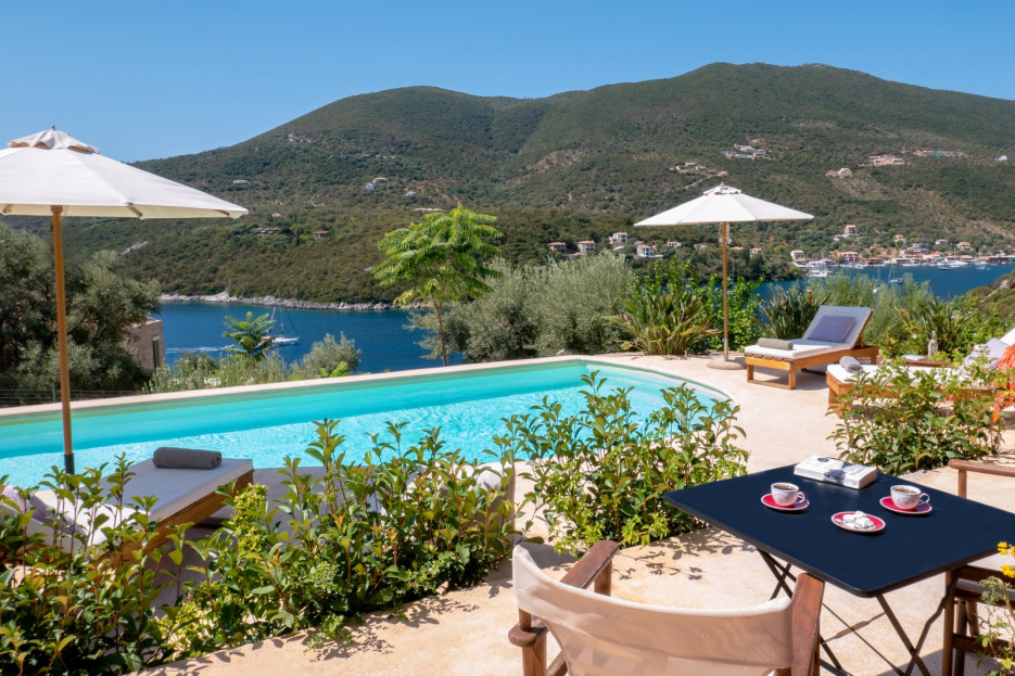 Escape to Villa Phos, where traditional Lefkadian architecture meets Mediterranean luxury. This authentic stone villa with wooden-beamed ceilings sits elevated within a private 4-acre estate of olive groves and fruit trees, offering uninterrupted sea views and your own pathway to crystal-clear Ionian waters.