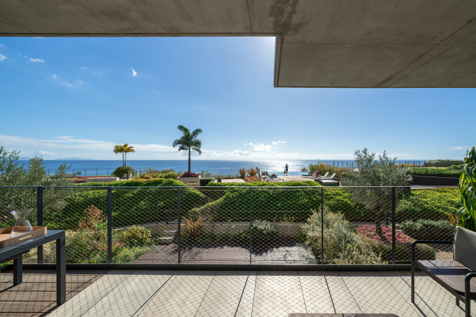 The social area includes a fully equipped kitchen that opens into the living and dining room, creating a welcoming space for socializing, enjoying meals together, or unwinding after a day of exploring. The living room and one of the suites have access to a shared balcony, perfect for taking in the sea view and enjoying Madeira’s mild climate.
