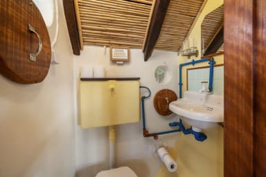 Outdoors, guests can enjoy a pleasant open-air area with a dining table, sun loungers and an outdoor shower, perfect for relaxing after a day at the beach or exploring the island.
