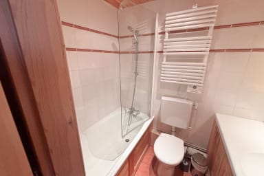 - A bathroom with a bathtub (with shower attachment) and a toilet within the bathroom