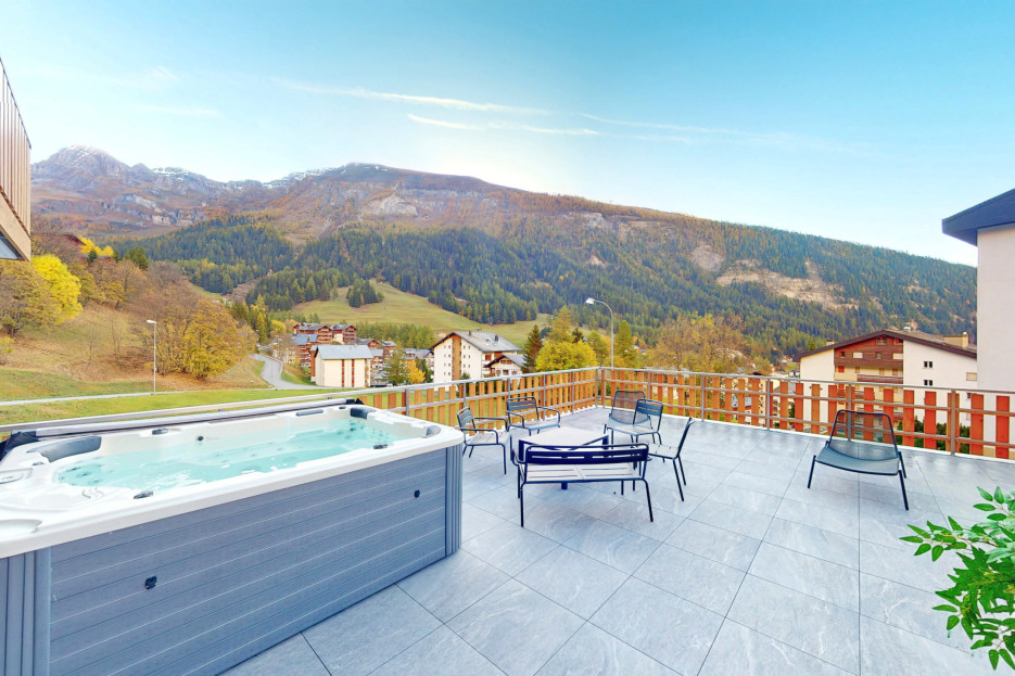 - A beautiful terrace of 80m2 facing south, with a breathtaking view of the mountains. It has a dining area, a lounge area with seats and deckchairs, but also a jacuzzi to relax after a day in the mountains.
