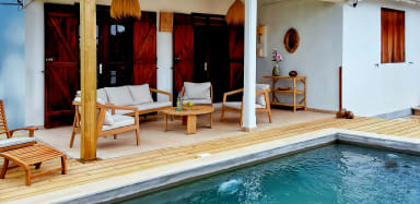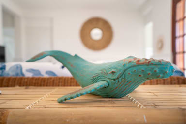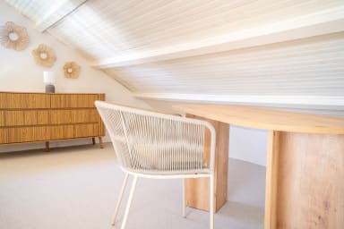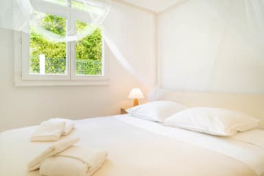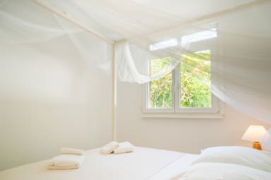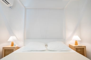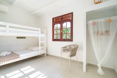 Measuring 125 m² on one level, the villa has four air-conditioned bedrooms, all equipped with mosquito nets. Three have comfortable 160 cm beds, while the fourth has bunk beds perfect for younger guests. The two contemporary bathrooms and two toilets guarantee every comfort. The fibre-optic internet connection is of exceptional quality, guaranteeing fast, stable browsing.