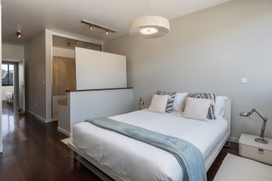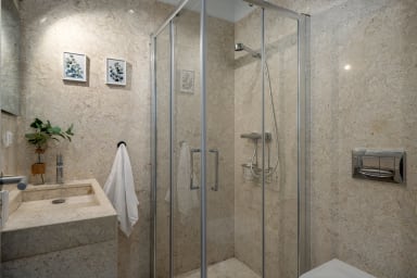 The apartment has two bedrooms: one with twin beds, ideal for additional guests, and a suite with a double bed and private bathroom with bathtub, ensuring comfort and privacy. There is also an additional bathroom with shower for convenience.