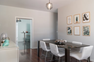 The spacious, bright living room includes a balcony overlooking Avenida das Madalenas, perfect for relaxing and watching the city. The kitchen is fully equipped and features a small laundry area, making meal preparation easy.