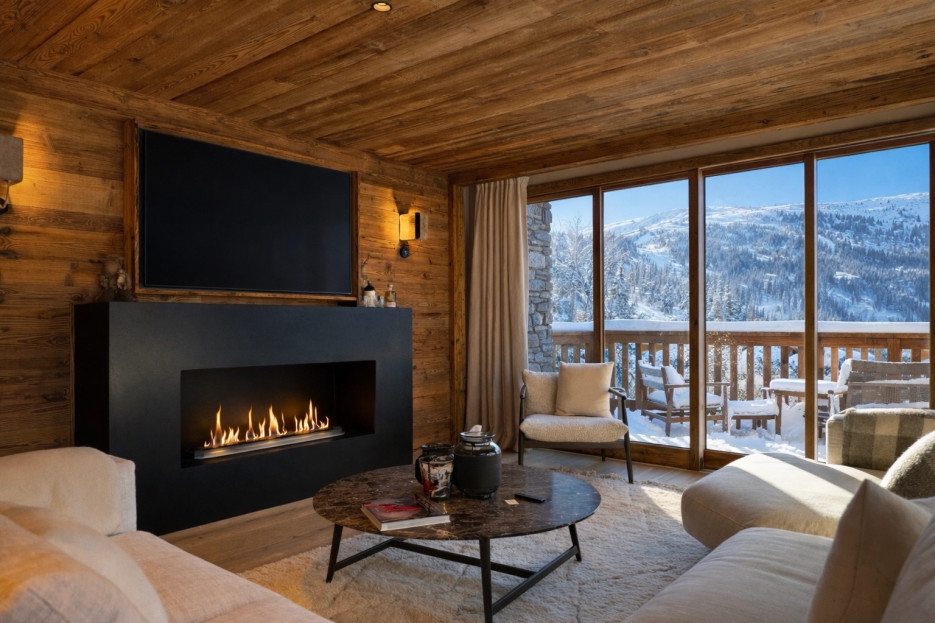 In Méribel (Morel area), Alpenglow is a stylish 125 m² apartment on the first floor of a high-end residence, close to shops and around 100 m from the Morel chairlift. It features a warm alpine atmosphere with aged wood finishes, a bright living room with an ethanol fireplace, a fully equipped kitchen, a dining area, and a terrace with stunning mountain views.