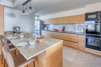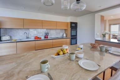 - a fully-equipped open kitchen (barbecue, coffee machine, toaster, blender, kettle, oven, microwave, hob, dishwasher, fridge, freezer) and a large dining table,