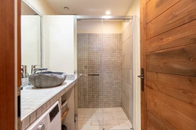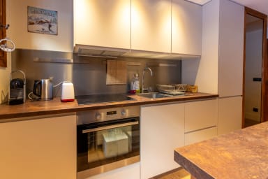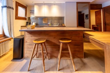 Les Lauzes 32-46 is an unusual duplex arranged as two separate areas located one floor apart, ideal for sharing a stay while still enjoying privacy. The main apartment includes a master bedroom with a 160 cm double bed, a cabin-style sleeping area with bunk beds (no window), a bathroom, separate WC, and an open-plan kitchen leading into the living room with access to a small outdoor terrace. On the other level, a second independent space offers a double bedroom and a shower room with WC. The apartment is fully equipped, with Wi-Fi and a washer-dryer, and you also have access to a shared ski room for storing your equipment.
