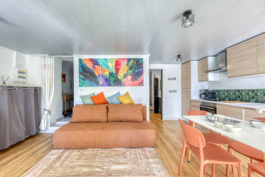 - a charming living room with sofa bed and dining area,