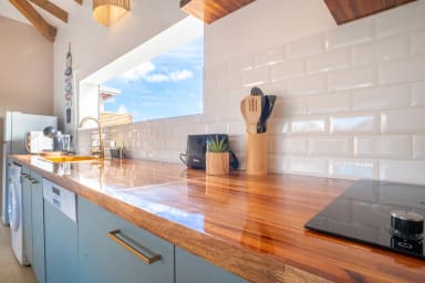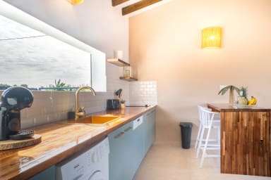- Fully equipped kitchen opening onto the outdoors + Coal barbecue