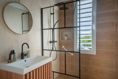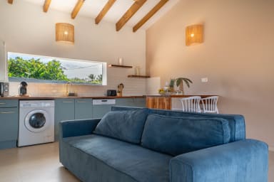 Enjoy a fully equipped modern kitchen that opens onto a large plunge pool, the perfect spot to sip a cocktail under the Caribbean sun. The private 3x3 meter swimming pool invites you to moments of pure relaxation. For those wishing to stay as a group, the adjoining twin villa (Cotoon Lodge 2 - Ti Koton) next door allows accommodation for up to 8 guests in complete privacy.
