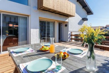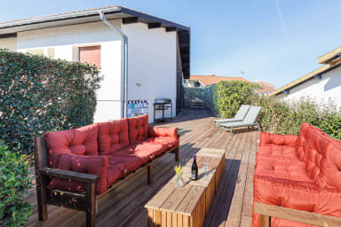 Hossegor La Centrale: less than 100m from the beach, discover this magnificent 1,280 sq ft house that can accommodate up to 10 people. It offers renovated interior spaces, several outdoor relaxation areas, and an ocean view from the master suite upstairs. Ideally located, enjoy a stay by the sea!