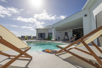 Welcome to Villa Akébé, an architectural gem nestled in the hills of Saint-François. This single-story, 5-star rated villa offers 162 m² of refined living space where luxury meets comfort. With its 4 elegant suites (3 with queen size 160cm beds, 1 with two simple 90x200 beds), you are guaranteed restful nights after days filled with discovery.