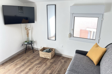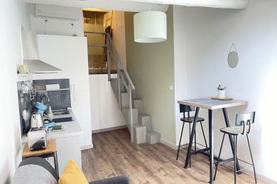 The space is cozy and well-designed, featuring a fully equipped kitchenette, a warm and inviting living area with a comfortable sofa bed, and a lovely mezzanine where you'll find the shower room and toilet, accessible via an elegant Japanese step staircase. The decor is modern, tasteful, and carefully chosen to create a relaxing and pleasant atmosphere.