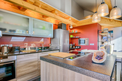 -une cuisine ouverte et parfaitement équipée (bouilloire, grille-pain, four, micro-ondes, plaques de cuisson, lave-vaisselle, frigo)