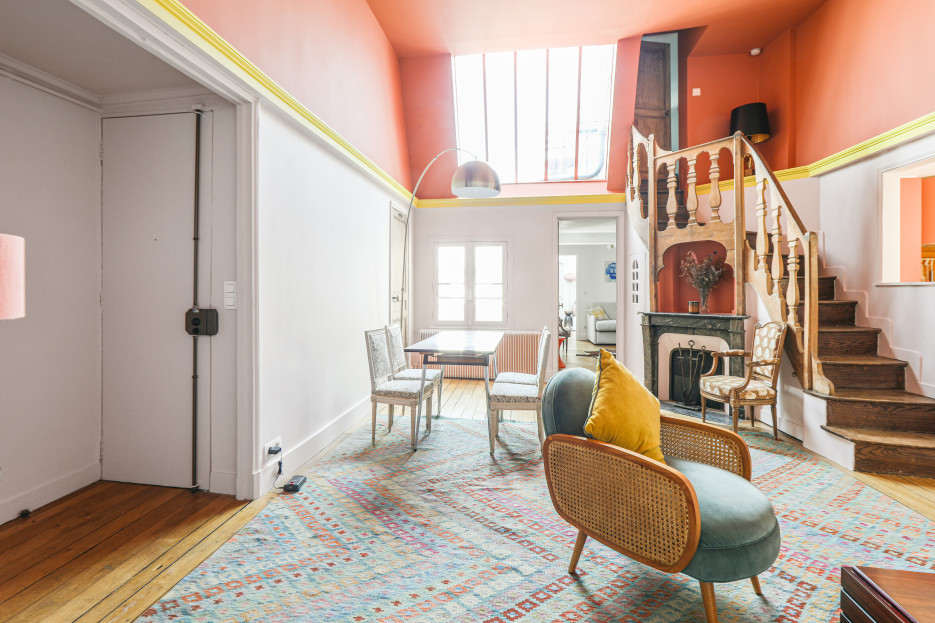 Appartement atypique de 60 m² en duplex avec terrasse, situé au 6ᵉ étage sans ascenseur. Ce logement chaleureux est composé de :