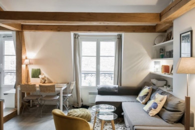 Cet très bel appartement aux poutres apparentes de 39 m², situé au 5ème étage avec ascenseur dans un immeuble de standing, est composé de :