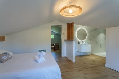 - une chambre avec un lit queen size (160 cm) et une salle de bain attenante avec douche à l'italienne,