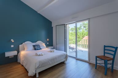 - une chambre comprenant un lit king size (180 cm) et une salle de bain attenante avec douche à l'italienne, et un accès au jardin,