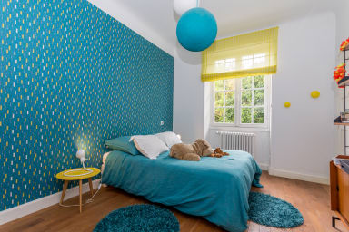 - une suite parentale avec un lit queen size (160 cm), un espace bureau et une salle de bain privative (baignoire, douche et WC),
