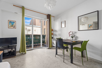 Découvrez ce studio agréable et bien équipé situé au deuxième étage d'un immeuble de Nice. Profitez de la vue sur la cour intérieure depuis le petit balcon équipé d'une table et de deux chaises.