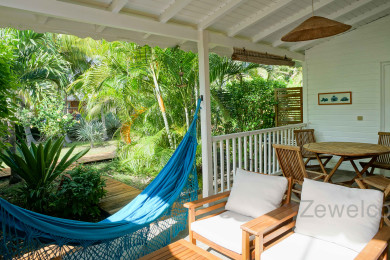 Salon dans le jardin. Barbecue et bien évidement le hamac pour pouvoir se reposer sous la brise des alizés.