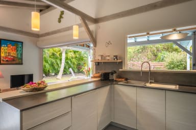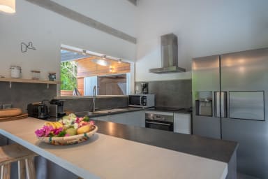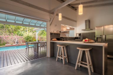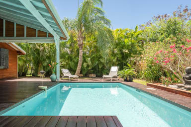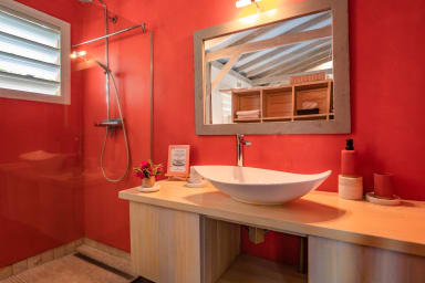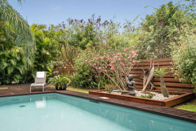 La villa Bouddha 1 résolument créole avec des inspirations balinaises. Intimistes, les lieux de vie et de nuit sont tournés vers la belle terrasse couverte et ventilée et la piscine. Une cuisine américaine parfaitement équipée avec un grand passe plat ouvrant sur la terrasse, et un bar sur le petit séjour audio visuel. Deux grandes chambres climatisées meublées avec goût. Lit en 160 pour l'une et Queen size pour l'autre. Elles possèdent toutes les deux, leur belle salle de douche à l'italienne, avec toilettes privatives,
