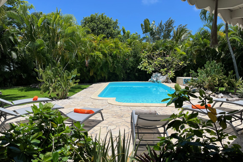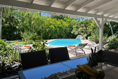 Intimiste à l'abri des regards, nichée au milieu d'un écrin de verdure en lotissement privé à moins de 3 km de toutes commodités et des plages, superbe villa avec piscine. Décoration mêlant douceur balnéaire et couleurs des caraibes.