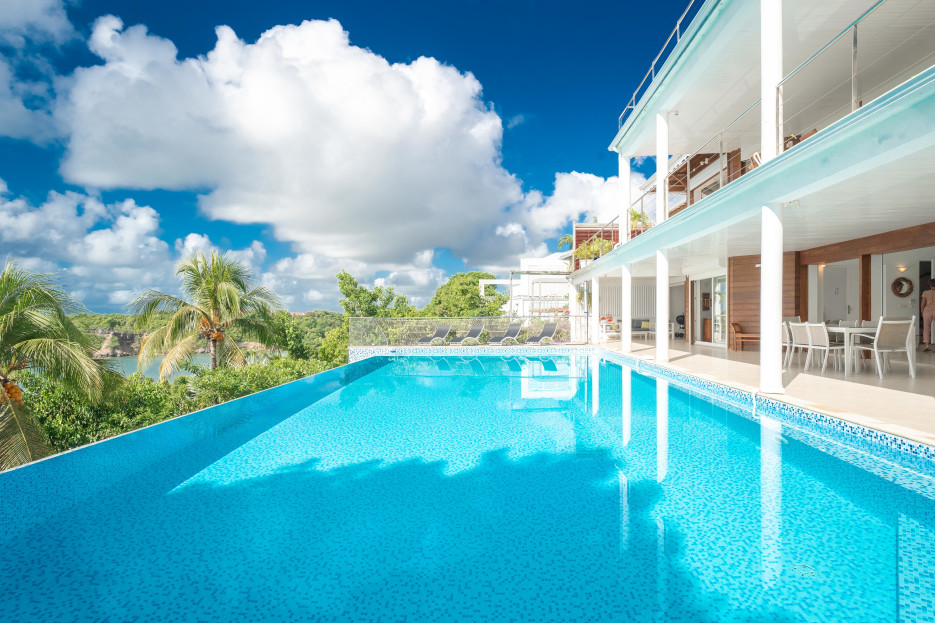 Villa spacieuse avec vue mer à couper le souffle, piscine privée, ambiance discrète et raffinée. 4 chambres climatisées et 4 salles de bain à disposition.