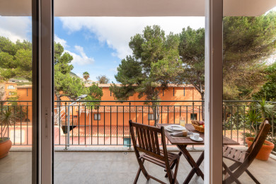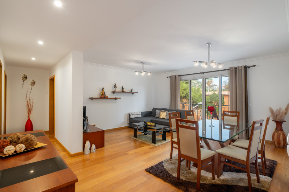 Le salon, intégré à la salle à manger, offre une atmosphère accueillante et a également accès à un balcon, offrant encore un autre espace extérieur pour profiter de votre séjour. L'appartement comprend également une cuisine entièrement équipée, complétée par un espace buanderie fonctionnel, et une salle de bain pour les invités pour plus de commodité.