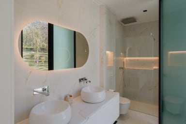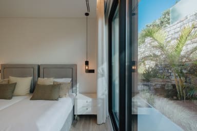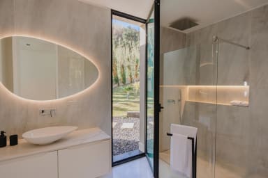 La villa dispose de trois chambres : une suite avec lit double, une chambre avec lit double et une chambre avec deux lits simples, garantissant intimité et confort. Elle comprend une salle de bains en suite, une salle de bains supplémentaire avec douche et une buanderie à côté du four, équipée de machines à laver et à sécher.