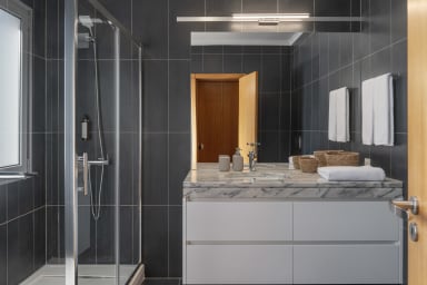 Au rez-de-chaussée, vous trouverez une cuisine entièrement équipée, une buanderie, une salle à manger, des toilettes pour les invités et un salon lumineux avec accès à l'espace extérieur, idéal pour se détendre ou profiter de la vue. À l'étage supérieur, la villa offre quatre chambres à coucher, toutes dotées d'une salle de bains privée - trois avec douche et une avec baignoire. Deux des chambres disposent de lits doubles, tandis que les deux autres ont deux lits simples chacune, ce qui garantit flexibilité et confort à tous les hôtes.