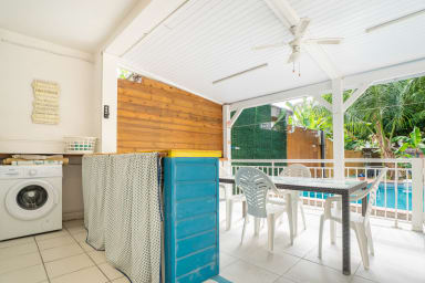 Laissez-vous séduire par le jardin tropical où se niche une piscine privative, parfaite pour des moments de détente sous le soleil des Caraïbes. La terrasse couverte avec un coin bar invite aux apéritifs conviviaux après une journée de découverte. Et pour les surfeurs, c’est l’endroit idéal pour se relaxer après une session exaltante.