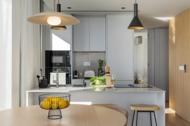 La zone de vie se compose d'un salon et d'une cuisine ouverts, créant un espace lumineux et accueillant, idéal pour se détendre ou préparer les repas. L'appartement dispose également d'une salle de bains pour les invités pour plus de commodité.