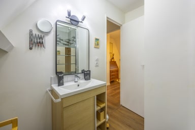 - à l'étage, une chambre avec un lit queensize et une salle de bain attenante avec douche,
