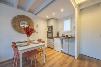 - une cuisine ouverte bien équipée (machine à café, grille-pain, bouilloire, four, four micro-ondes, plaques de cuisson, réfrigérateur), et un espace repas,